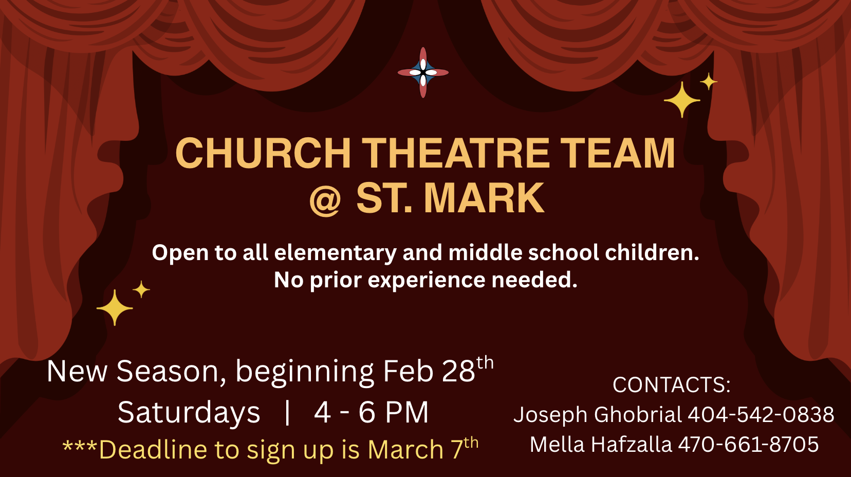 Parents, the new season of kids theatre at St. Mark begins on February 28th. This theatre group requires a commitment to practices held every Saturday from 4-6pm.